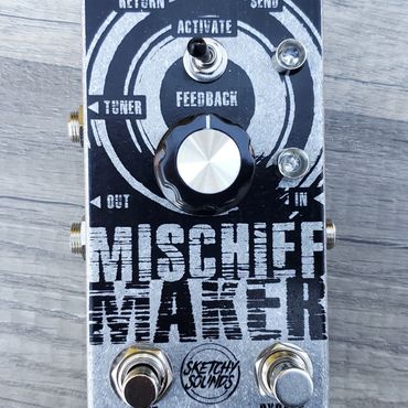 First, plug your guitar into the input. Then, with a small patch cable from the “Send” jack, plug in to your favorite pedal (or multiple pedals). Next, connect another patch cable from the output of your pedal to the “Return” jack on the Mischief Maker. Last, run a guitar cable from the Mischief Maker’s output to your guitar amp. Now you’re ready for some mayhem (or possibly some angelic, haunting reverberations...it’s up to you). Just flip the “Activate” switch and play with the “Feedback” knob to explore some new sounds.